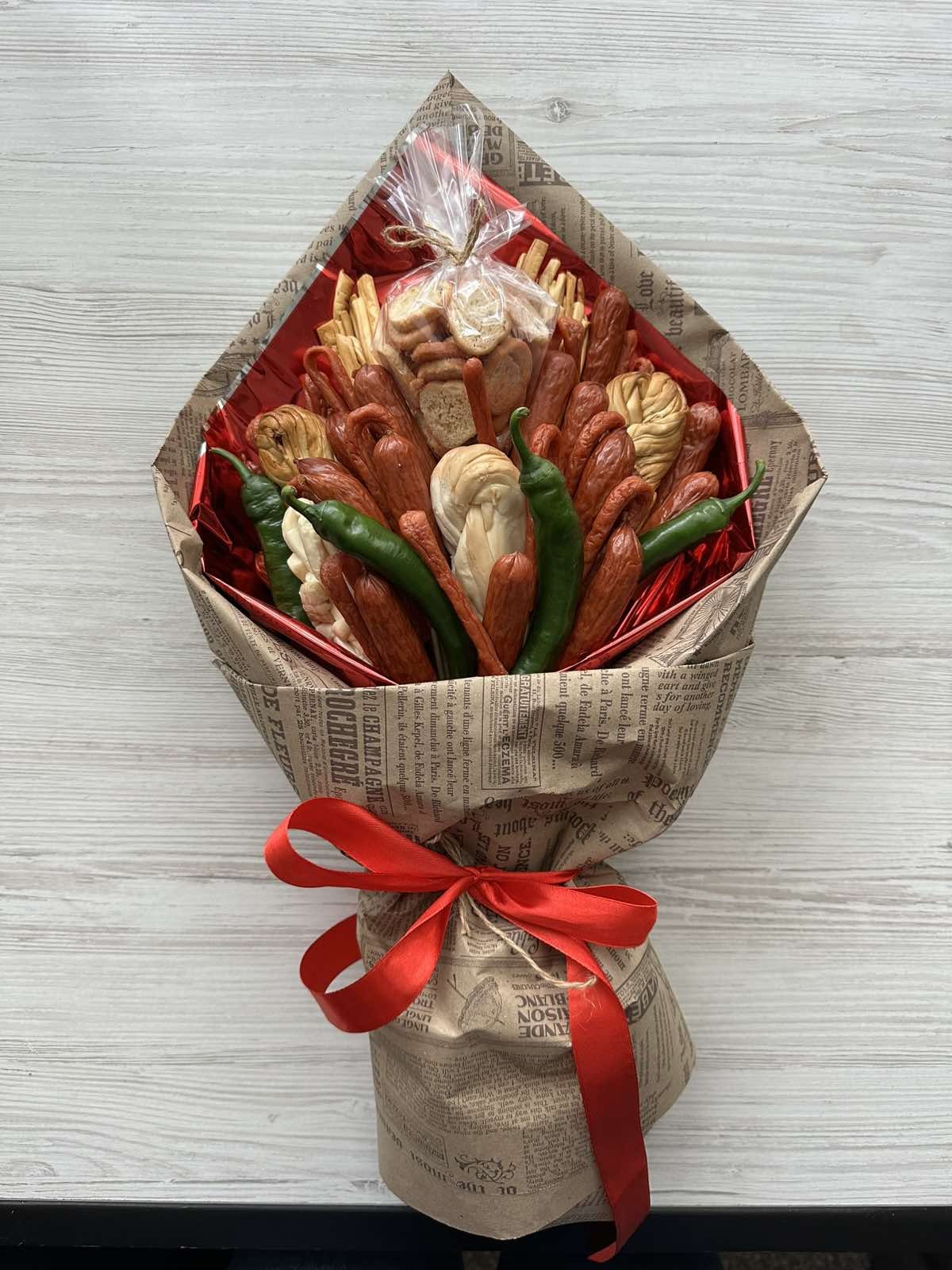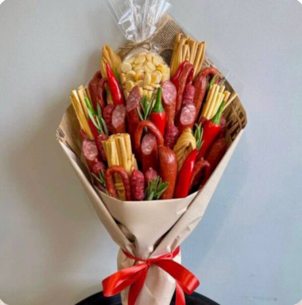 Цей брутальний та стильний букет створений для справжніх гурманів. Поєднання ароматних ковбасок, пікантного перцю, сирної косички та хрумких сухариків — це не просто подарунок, а гастрономічний виклик! Ідеально підходить для чоловіків, які цінують смачні та нестандартні рішення.