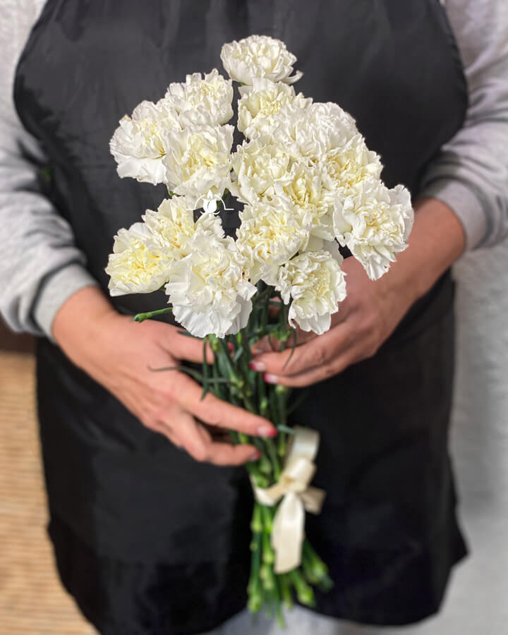 Лаконічна та світла композиція з 20 білих гвоздик. Поєднання білого кольору та чорної стрічки створює акуратний та стильний вигляд.