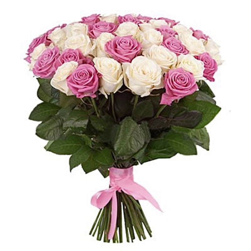Витончена композиція з 35 троянд у ніжних білих та рожевих відтінках, оформлена у стильне пакування. Поєднання кольорів символізує чистоту, щирість та теплі почуття, створюючи атмосферу любові й турботи.