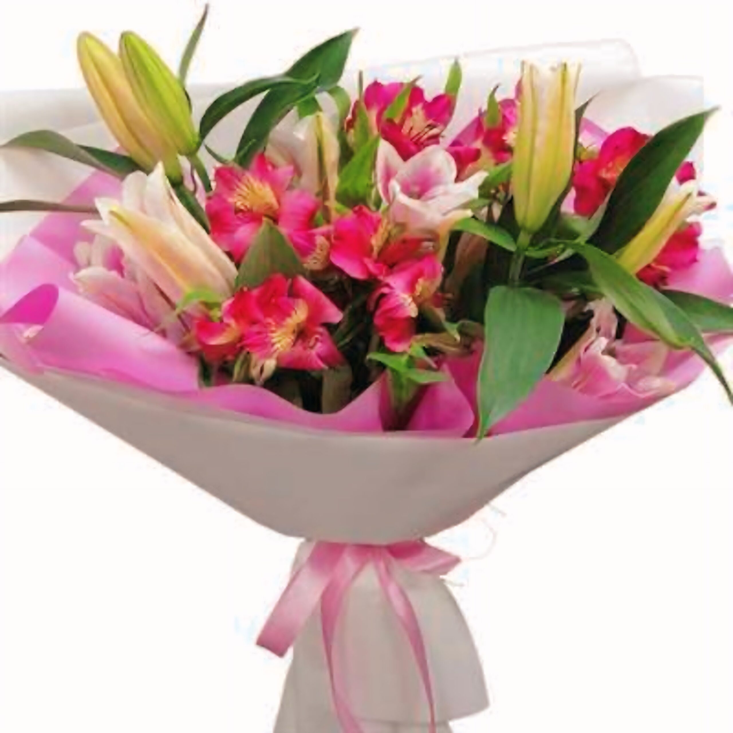 Вишуканий букет із лілій та альстромерій у ніжно-рожевій палітрі — це елегантне поєднання тепла, турботи та жіночності. Його м’яка кольорова гама, легкий аромат і делікатна текстура квітів створюють справжню атмосферу затишку та радості.