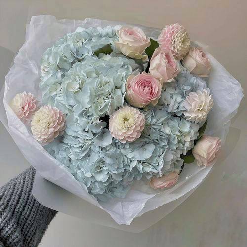 Цей витончений букет — поєднання трьох улюблених квітів: об’ємної гортензії, благородної троянди та фактурної жоржини. Кожен елемент доповнює інший, створюючи багатошарову композицію з глибоким емоційним змістом. Ідеальний для особливої нагоди або коли хочеться справити враження без зайвих слів.