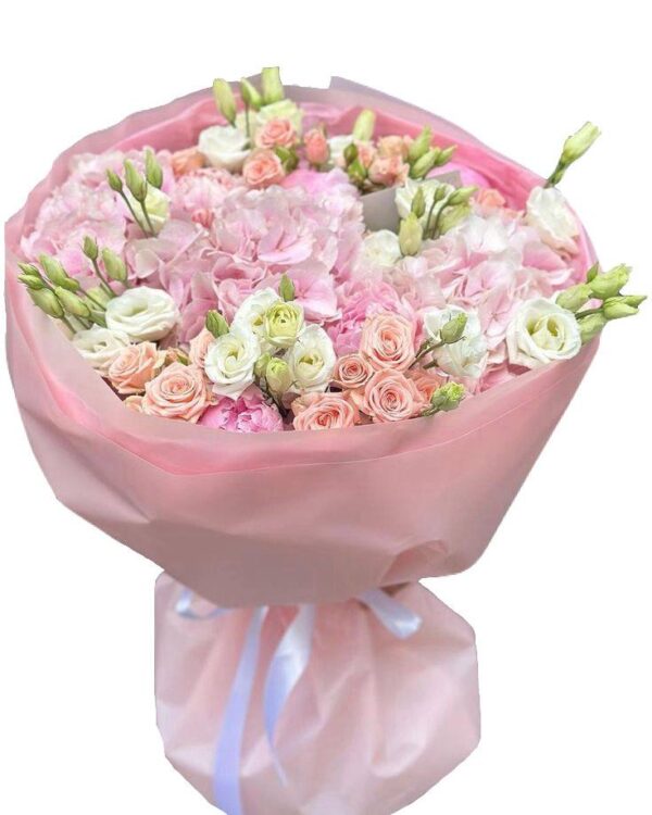 Як вишукано гарний цей букет! Кожна квітка в ньому — втілення краси і ніжності. Поєднання повітряної гортензії, делікатної еустоми, розкішних півоній та витончених кущових троянд створює неперевершену композицію, яка не залишить байдужою жодну жінку. Цей букет — справжній подарунок, що здатен викликати захоплення і теплі емоції.