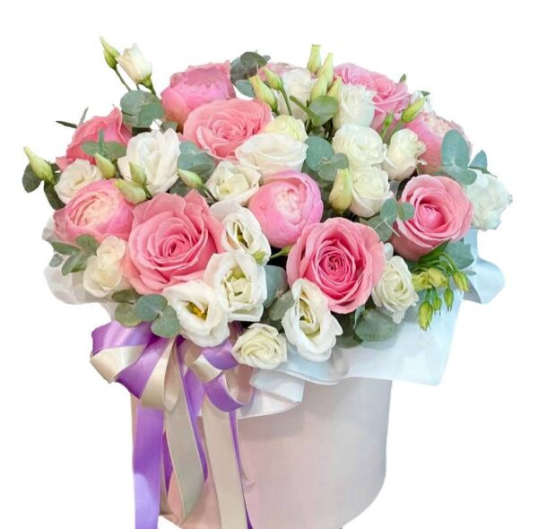 Вишукана композиція, що поєднує ніжні рожеві троянди, повітряну білу еустому, елегантну білу кущову троянду та розкішні рожеві півонії. Цей букет у стильному боксі — ідеальний подарунок, який дарує гармонію кольору, свіжість і теплі емоції.