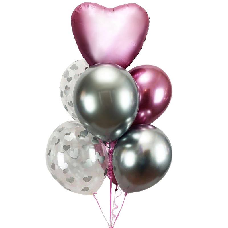 Яскравий та стильний подарунок для будь-якого свята! У цю композицію входять чотири латексні кульки серії “Хром”, дві латексні кульки з конфетті та велике фольговане серце — все, щоб створити атмосферу радості та святкового настрою.