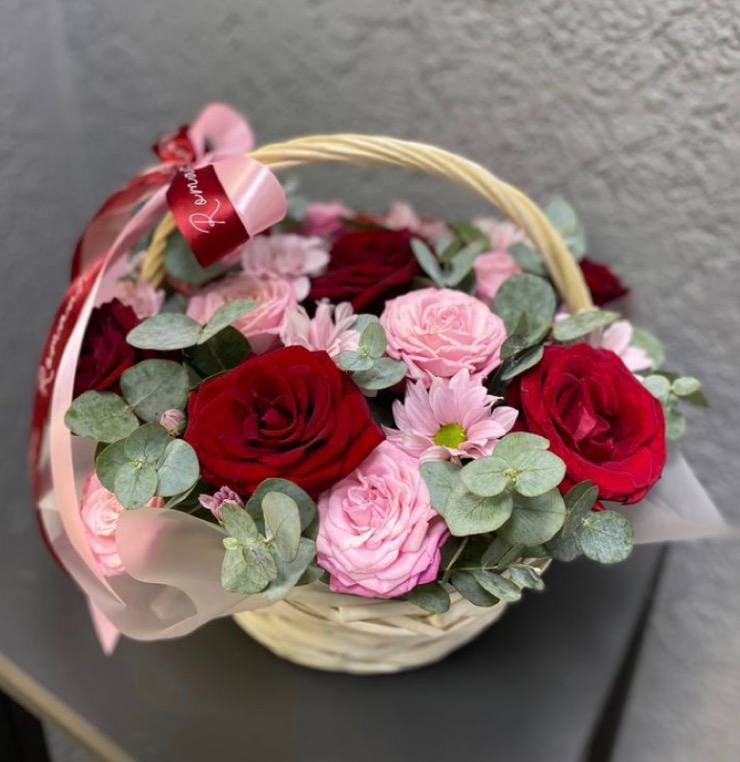 Яскрава та водночас ніжна композиція, що поєднує глибокі відтінки червоних троянд із м’якими рожевими акцентами. Доповнений евкаліптом, кошик виглядає свіжо, гармонійно та дуже стильно.