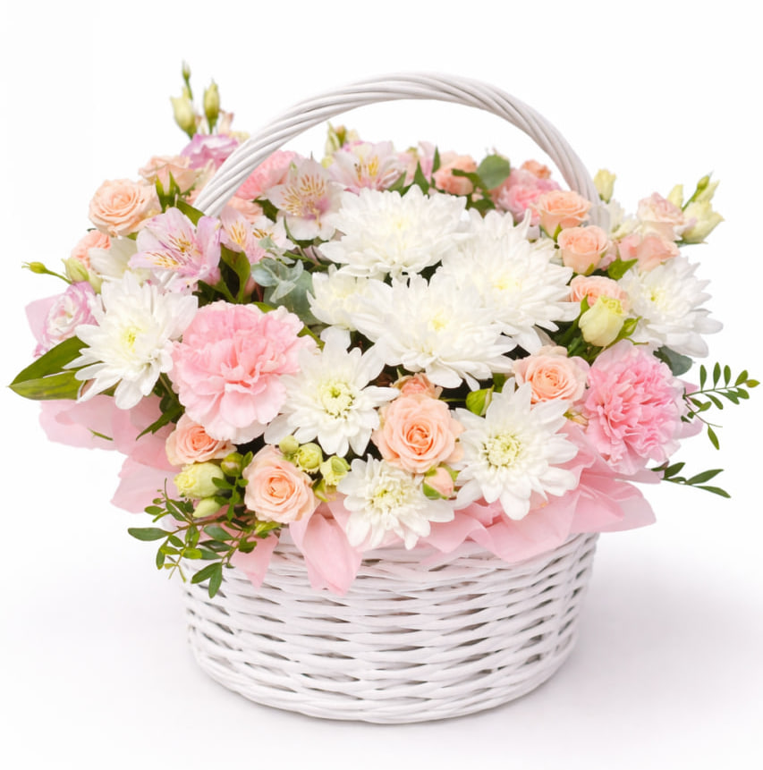 Вишукана квіткова композиція у плетеному кошику, створена в ніжній пастельній гамі. Поєднання троянд, хризантем та сезонних квітів виглядає гармонійно, легко та святково, наповнюючи простір теплом і весняним настроєм.