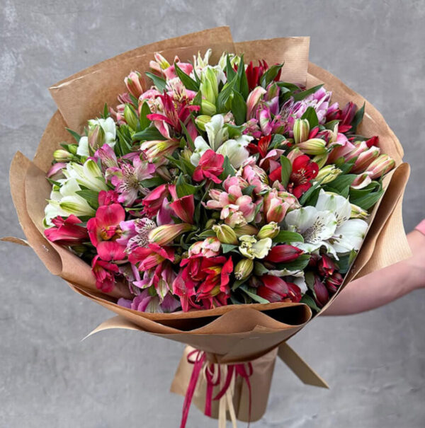 Яскравий і життєрадісний букет із 25 різнокольорових альстромерій наповнений енергією та світлом. Кожна квітка дарує радість і легкість, а ніжний декор підкреслює природну красу композиції.