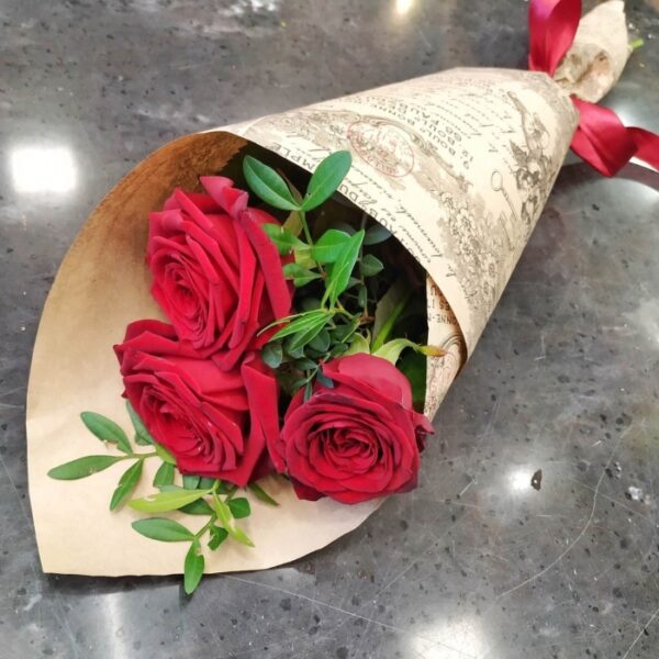 Три червоні троянди — символ щирості, кохання та поваги. Доповнені свіжою зеленню та оформлені в елегантне декоративне пакування, вони створюють витончену композицію, що говорить більше, ніж слова. “Сабріна” — ідеальний вибір для стриманого, але емоційного жесту.