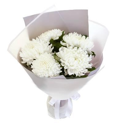 Цей лаконічний букет із п’яти хризантем — не просто квіти, а жест душевної тепла та щирості. Кожна квітка мовчки висловлює турботу, спокій та глибоку повагу. Біла хризантема — символ чистоти, миру та відданості, а в такому оформленні вона стає витонченим способом сказати «я поруч» навіть без слів.