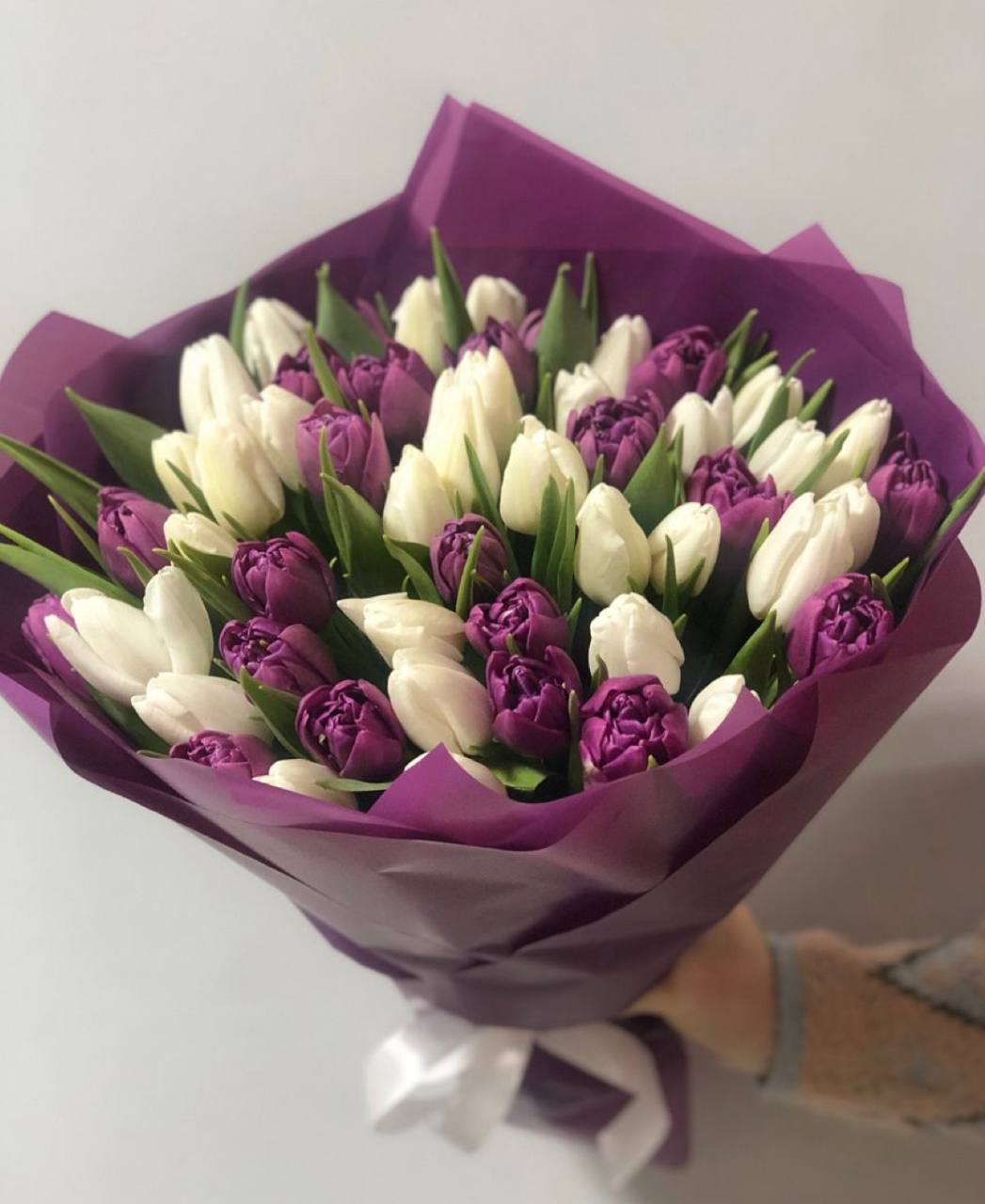 Вишуканий букет із 51 тюльпана у біло-фіолетовій гамі — це поєднання чистоти, спокою та глибоких почуттів. Білий колір символізує щирість і світлі наміри, а фіолетовий додає композиції елегантності, загадковості та розкоші.