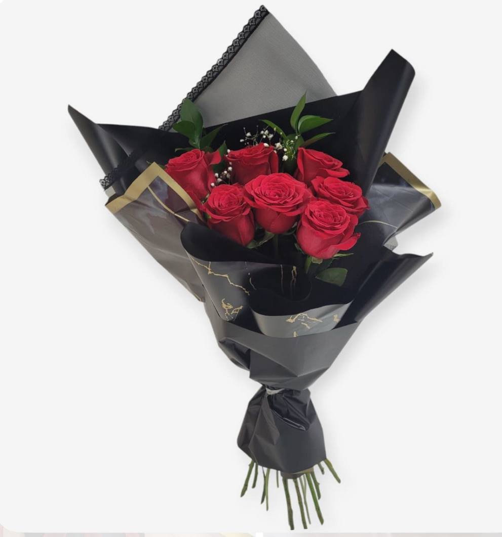 Склад: 8 червоних троянд, декоративне чорне пакування.