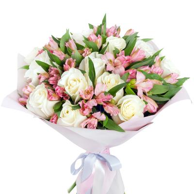 Цей гармонійний букет поєднує благородство білих троянд і ніжність рожевої альстромерії. Композиція наповнена світлом, легкістю та душевним теплом. Ідеально підходить для щирих привітань, подяк або ніжного жесту уваги.