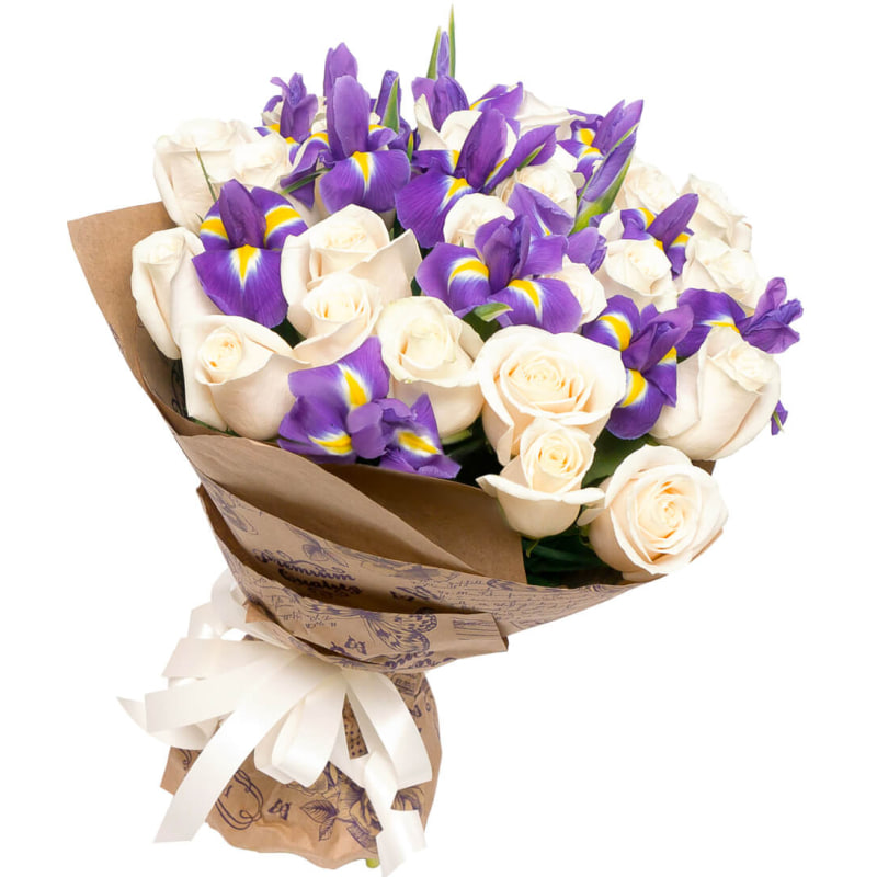 Вишуканий букет, у якому поєднуються ніжні білі троянди та яскраві іриси. Контраст чистоти білих пелюсток і глибоких фіолетових відтінків створює елегантну та стильну композицію. Такий букет чудово підійде для привітання, подяки або як приємний сюрприз для близької людини.