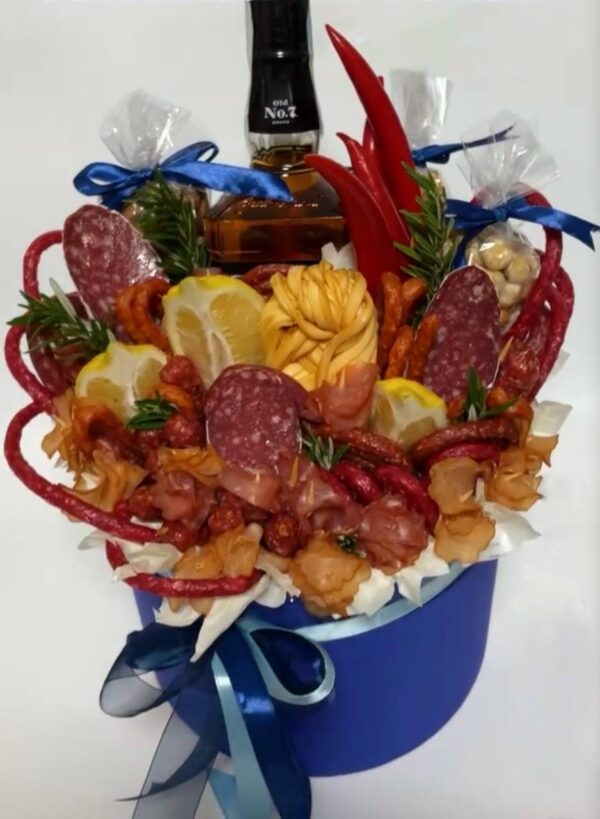 Цей гастрономічний букет — не просто набір смаколиків, а втілення мужності, сили та доброго смаку. Ідеальний вибір для чоловіка, який цінує якісні напої, насичений смак і стиль у кожній деталі. У композиції гармонійно поєднані пряні м’ясні делікатеси, горіхи, сир і пікантні акценти, що створюють незабутню гастрономічну палітру. А легендарний Jack Daniel’s додає букету статусу та шарму.