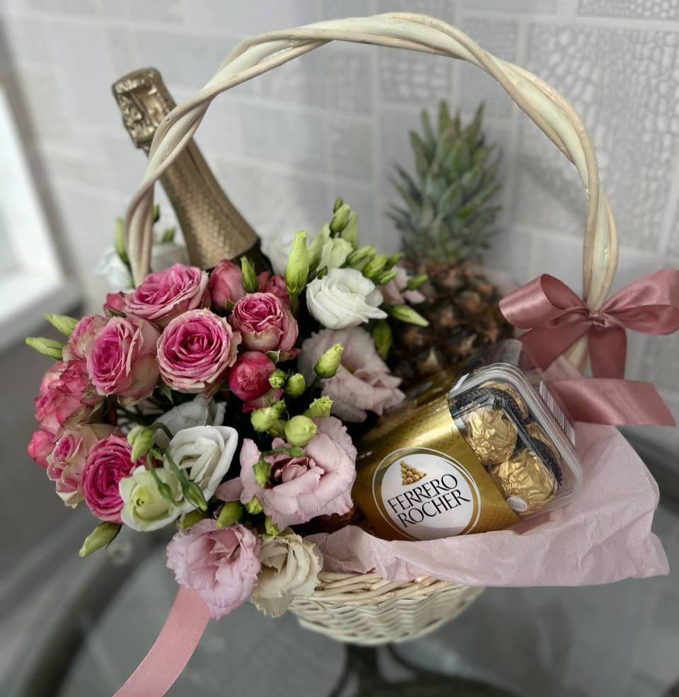 Цей елегантний кошик — готове рішення для подарунка, яке не потребує жодних доповнень. Він наповнений теплом, турботою та витонченістю. Соковиті фрукти, ароматні квіти, вишукані цукерки та пляшка шампанського створюють по-справжньому святкову атмосферу. Ідеальний вибір для дня народження, подяки, вітання або просто приємного сюрпризу.