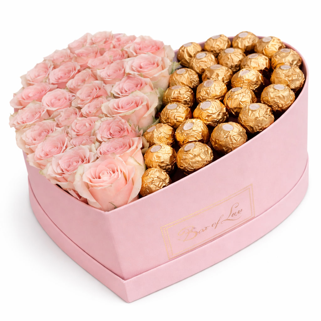 Ця композиція – справжня класика у найкращому виконанні. Поєднання 29 розкішних троянд та 24 цукерок Ferrero Rocher створює вражаючий подарунок, що підкорює з першого погляду. «Евелін» – це про кохання, вдячність і натхнення, яке не потребує слів. Вона ідеально підходить для особливих моментів, коли хочеться вразити по-справжньому.