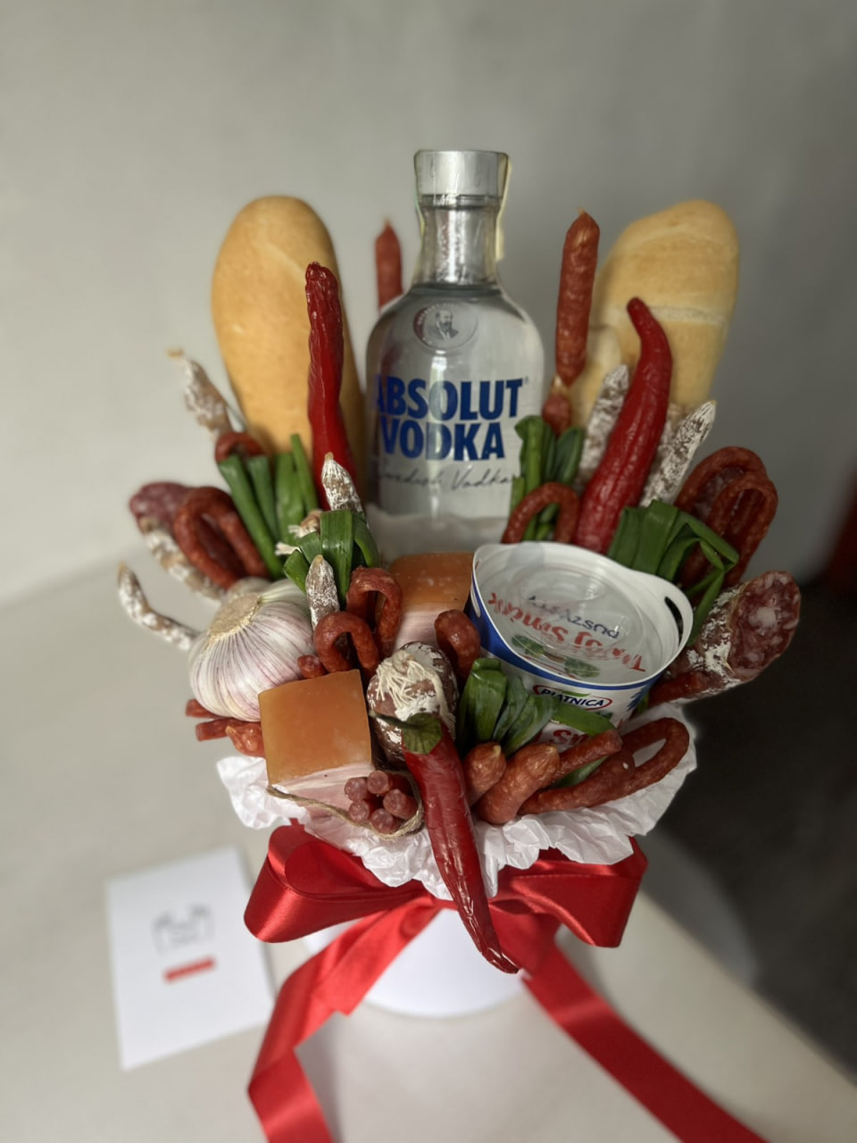Це не просто подарунок — це вау-ефект з першого погляду. Справжній вибух смаку для поціновувачів м’ясних делікатесів і пікантних поєднань. Елітна горілка, ароматні ковбаски, сир і хрумкий багет — ідеальний варіант на день народження, ювілей або будь-яке чоловіче свято.