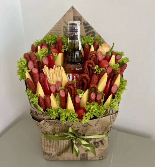 Цей букет — один із фаворитів серед наших клієнтів. Він ідеально поєднує у собі вишукані смаки та брутальний характер. У складі — найкраще для справжніх цінителів гастрономічного задоволення: ароматні ковбаски, сирні делікатеси, свіжа зелень і пляшка благородного напою.