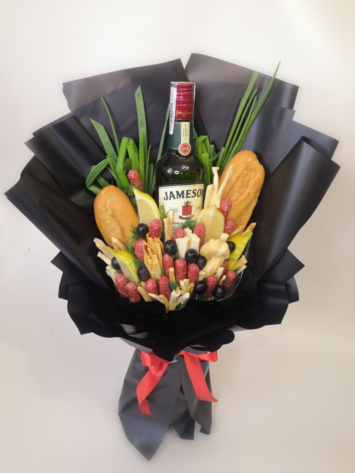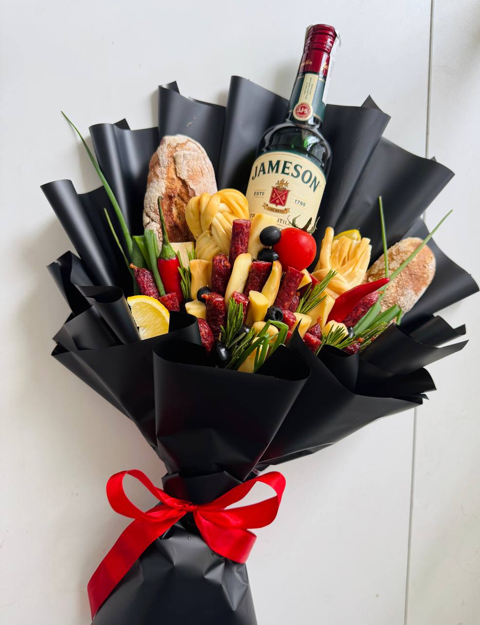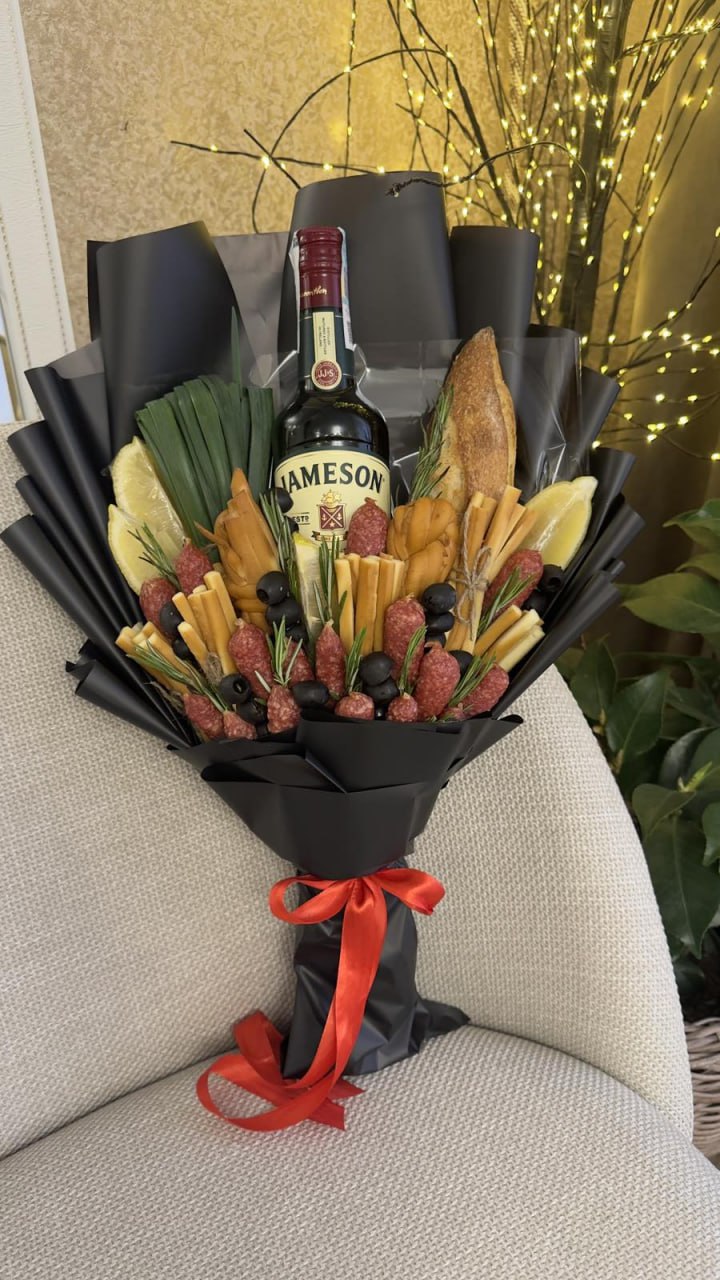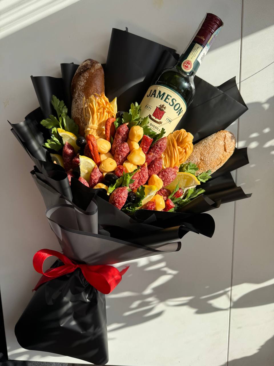 Цей букет з продуктів – не просто подарунок, а справжнє гастрономічне задоволення. Ідеальний для чоловіків, які люблять добре поїсти та насолодитися якісним напоєм, але й жінки з гарним смаком точно оцінять такий оригінальний комплімент. Поєднання копчених ковбасок, сирів, оливок, свіжого лимона та багету створює насичену, апетитну композицію. А пляшка віскі додає шарму та завершеності образу.
