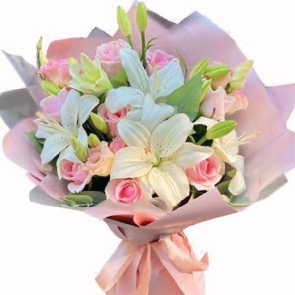 Цей вишуканий букет у світлих пастельних тонах — справжнє втілення ніжності, витонченості та тепла. Лілії, рожеві троянди й еустоми зливаються в гармонійну композицію, що дарує відчуття спокою, турботи та легкого романтичного настрою.