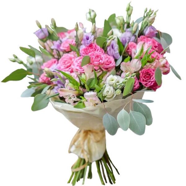 Цей витончений букет — гармонійне поєднання рожевих кущових троянд, фіолетової еустоми та білосніжної альстромерії, делікатно оздоблених гілочками евкаліпта та декоративним оформленням. Він наповнений теплом, романтикою й весняною свіжістю — ідеальний, щоб сказати найголовніше: «Ти — особлива».