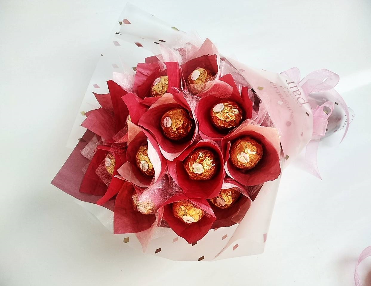 Ніжна композиція з цукерок Ferrero Rocher, дбайливо оформлена у прозору слюду, — це витончене поєднання краси, смаку та турботи. Такий букет легко транспортувати, приємно дарувати та ще приємніше — смакувати!