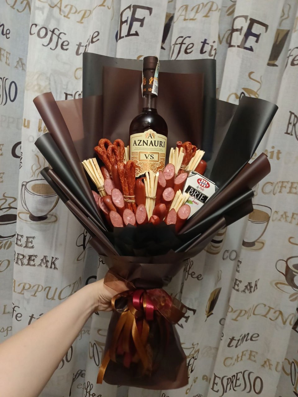 Цей насичений набір — поєднання вишуканих сирів, ароматних ковбасок і пляшечки доброго коньяку. «Скорпіон» — це букет з характером, який дарує не лише гастрономічне задоволення, а й справжню атмосферу свята.