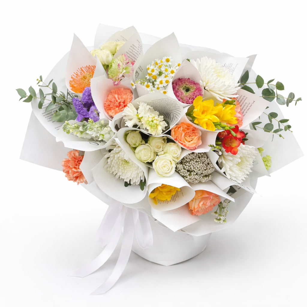 Цей витончений букет — наче перші промені сонця: м’який, теплий і наповнений ніжністю. Особливість композиції — кожна квітка оформлена в окреме стильне пакування, що робить букет не лише красивим, а й дуже практичним та оригінальним подарунком.